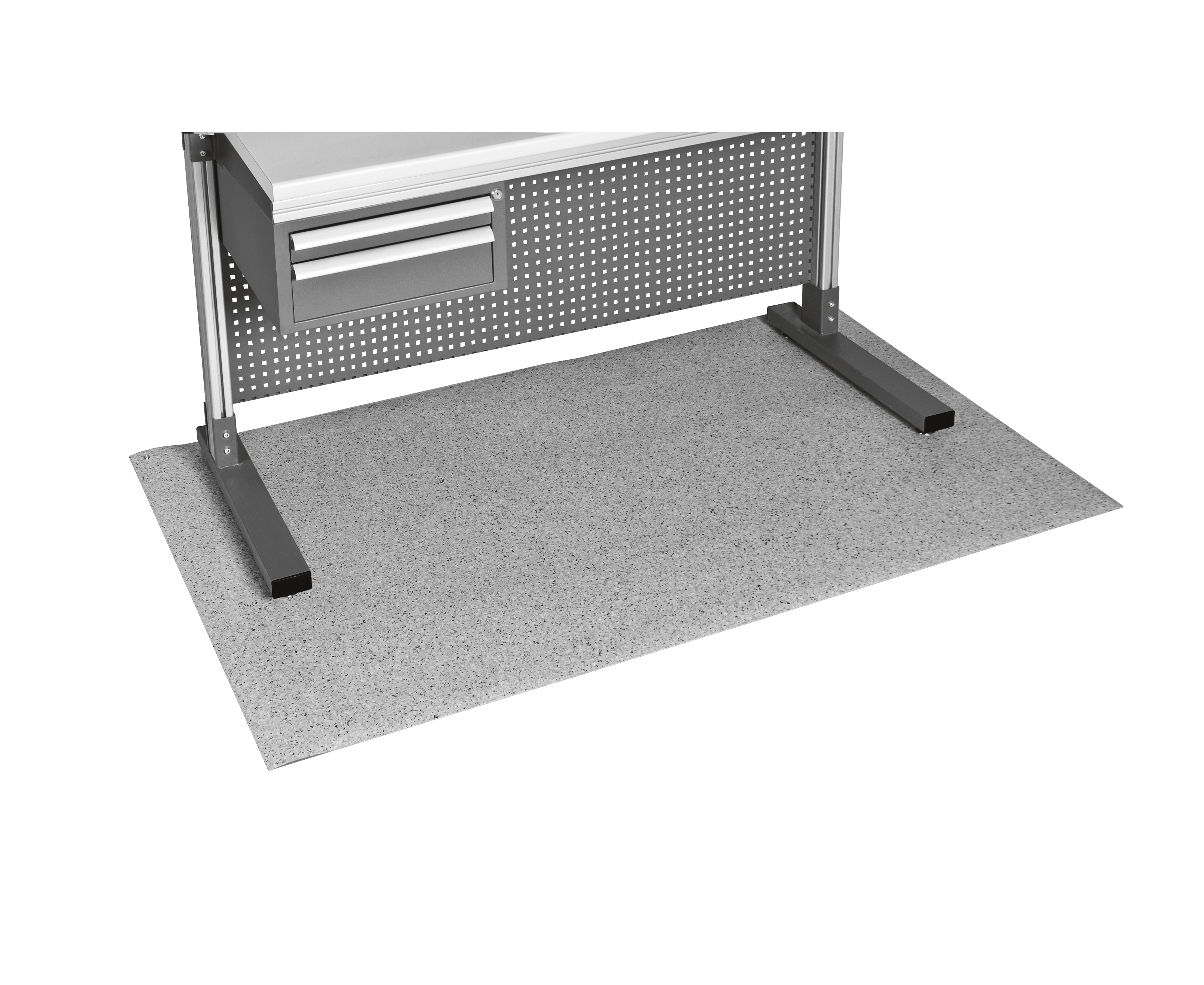 Двухслойный антистатический напольный коврик толщиной 2,5 мм, суперизносостойкий, шумопоглощающий, негорючий, термостойкий, верхний слой рассеивающий, нижний – проводящий: время стекания заряда от 1000 В до 50 В  – менее 0,5 с, сопротивление относительно земли менее 100 М0м, комбинированное сопротивление менее 35 МOм.