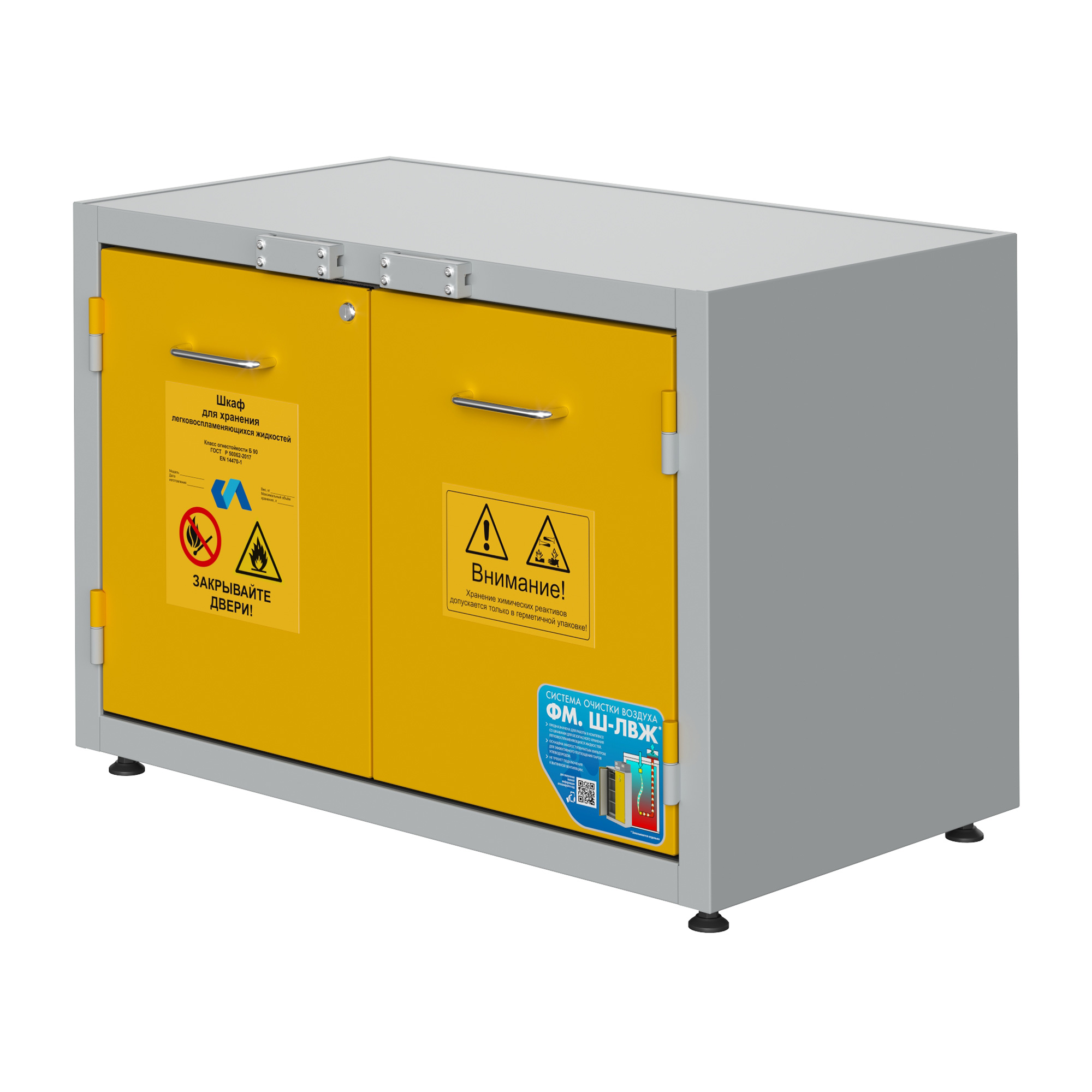 Испытания шкафа для хранения ЛВЖ на возгорание были произведены в аккредитованных лабораториях, в соответствии со стандартом ГОСТ Р 50862-2017. Шкаф изготовлен из стали толщиной 1,2 мм с и окрашен противокислотной порошковой эпоксидной краской, при температуре полимеризации 200° C. Толщина слоя краски составляет минимум 60 (микрон) и максимум 250 (микрон), в соответствии с требованиями ГОСТ 9-410-88 .Шкаф для хранения ЛВЖ обладает монолитной цельносварной конструкцией. Новая техника изготовления с двойной оболочкой, состоящей из двух корпусов, внутреннего и наружного. Новая огнеупорная изоляция, выполненная из экологически безопасного материала, характеризующегося высочайшей огнеупорностью. Внутренний корпус с панелями из не царапающегося материала, устойчивого к действию коррозийных веществ. Терморасширяющаяся прокладка 7 + 4 см, увеличивающаяся в объеме в случае пожара, полностью изолируя внутреннюю часть шкафа от внешней среды. Дополнительная терморасширяющаяся прокладка для защиты от пыли с защитой от “холодных и горячих дымов”. Распашные дверки, поддон для хранения из окрашенной эпоксидной порошковой краской электрооцинкованной стали, с противокислотной защитой, с решеткой, выполняющей роль полки. Объем сбора около 5 литров, грузоподъемность полки кг 80. Закрытие распашной двери шкафа для хранения лвж с автоматическим возвратом при каждом открытии. Система внутренней не форсированной вентиляции для паров, укомплектованная двумя предохранительными клапанами с автоматическим закрытием при температуре окружающей среды 70 ± 10° C, находящимися внизу и вверху, чтобы гарантировать автоматический выход наружу веществ, в соответствии с требованиями норматив. Наружный соединительный фланец для подключения к системе вытяжной вентиляции, диаметром 100 мм. Система предохранительного закрытия , автоматически срабатывающая и удерживающая дверь закрытой в случае пожара. Искробезопасные петли, расположенные по длине двери. Предохранительный цилиндровый замок, запирающийся на ключ. Плакаты, предупреждающие об опасности наличия возгораемых веществ и запрете курения, в соответствии с российскими и европейскими нормами безопасности. Клемма заземления на случай возникновения электростатического электричества. Регулируемые ножки для установки шкафа в горизонтальное положение. Руководство по эксплуатации и техобслуживанию.