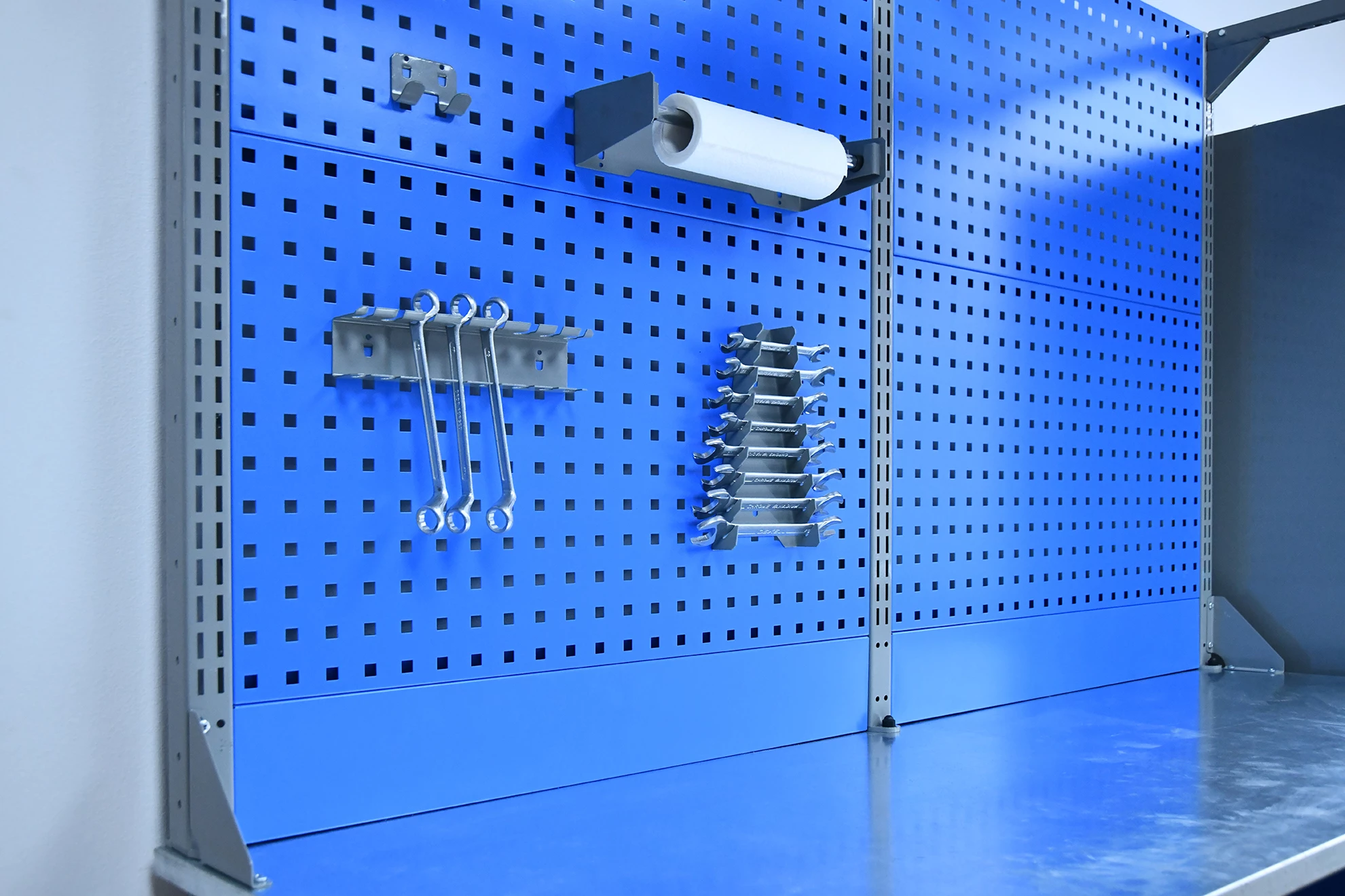 Экран (перфорированная панель) верстака выполнен с квадратной перфорацией 12х12 мм с шагом 38 мм для установки крючков, держателей и других аксессуаров. Экран крепится к столешнице с помощью специальных кронштейнов. Максимальная масса груза, равномерно распределенного по поверхности экрана - 21 кг.
