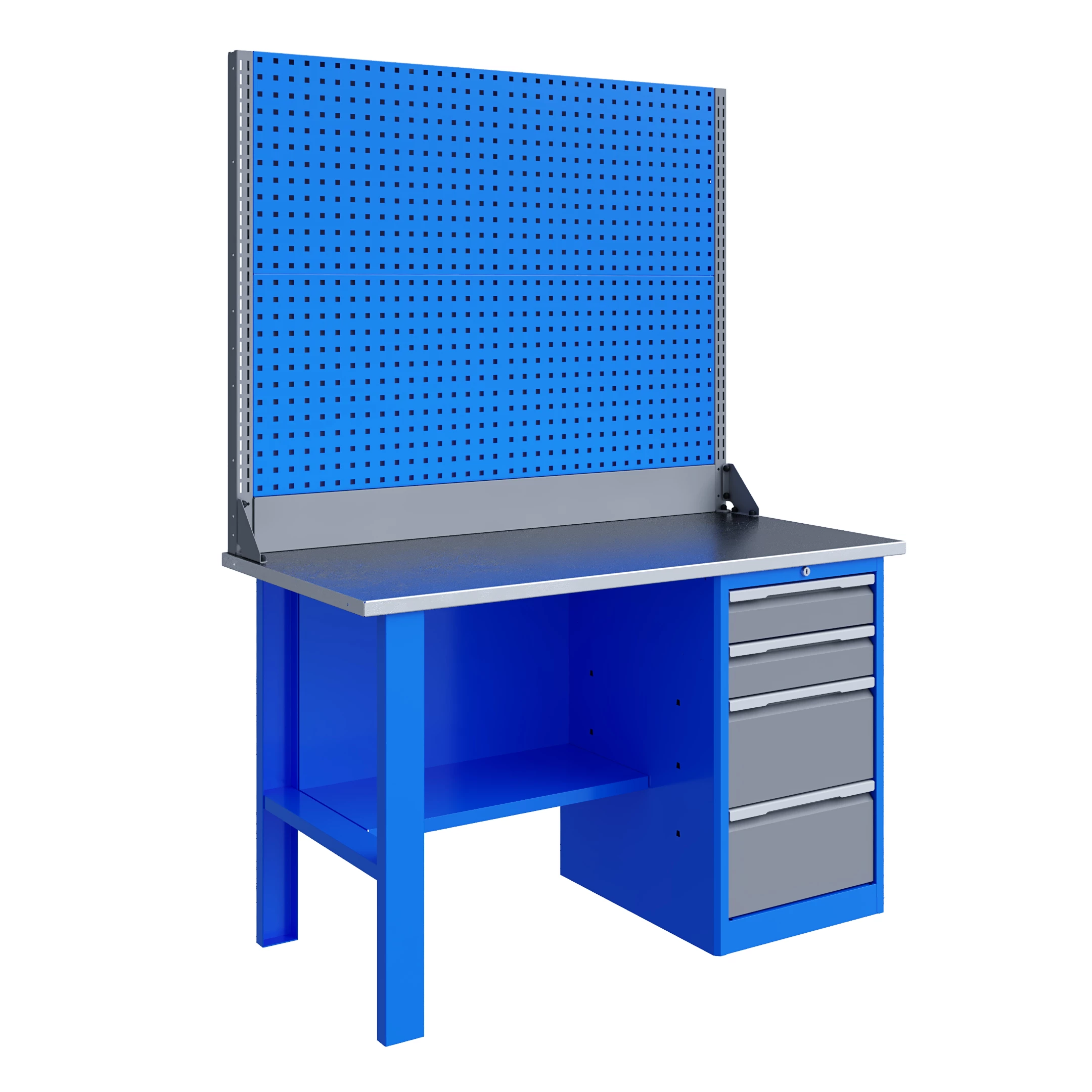 Верстак серии Technic 141.14.2-2 состоит из столешницы шириной 1396 мм, опоры, тумбы P4 с двумя малыми и двумя большими ящиками, полки-стенки, двойного экрана с кронштейнами