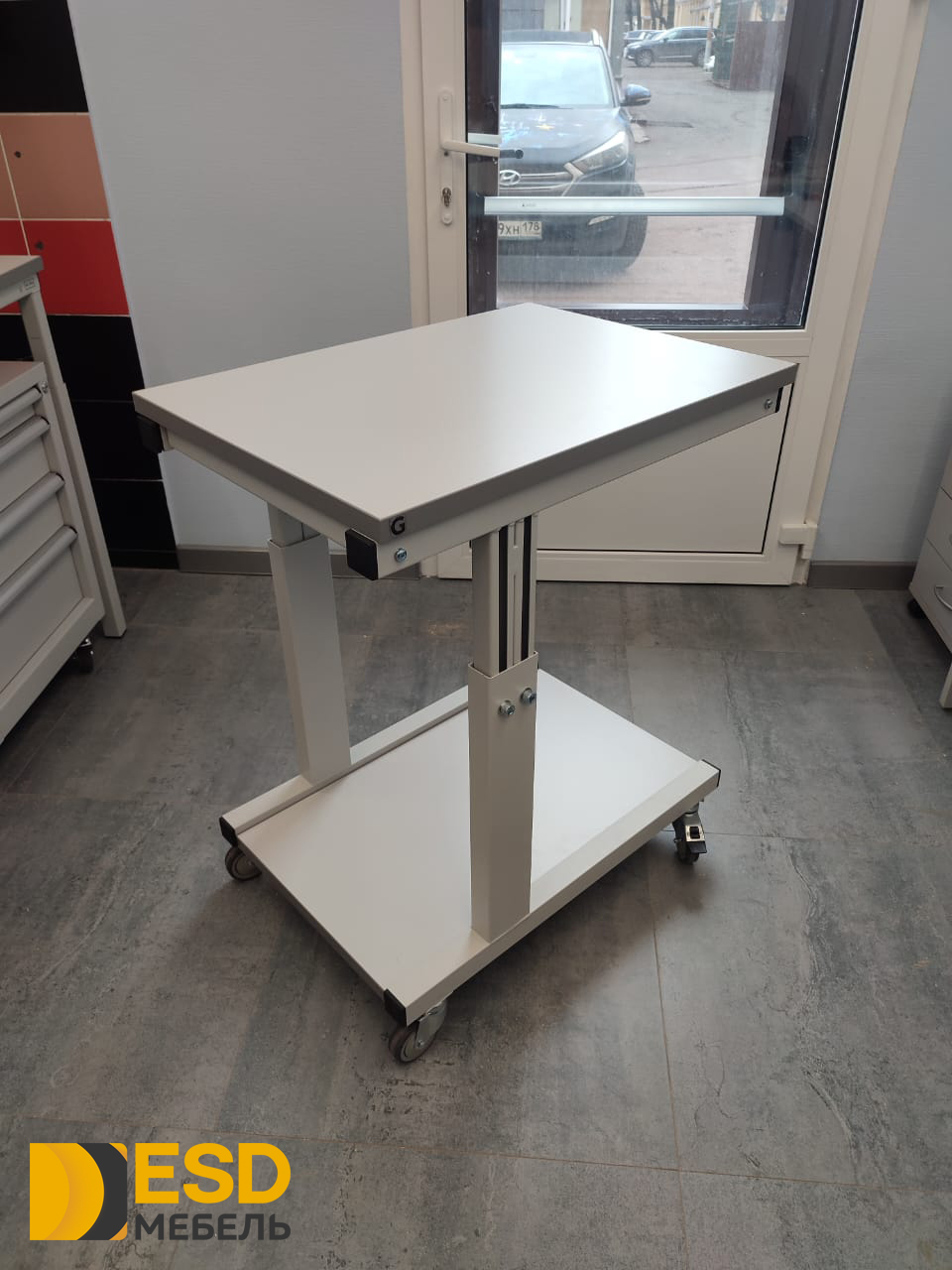 Антистатический подкатной стол, согласно требованиям стандарта ГОСТ IEC 61340-5-1-2019, на лицевой стороне столешницы имеет маркировку