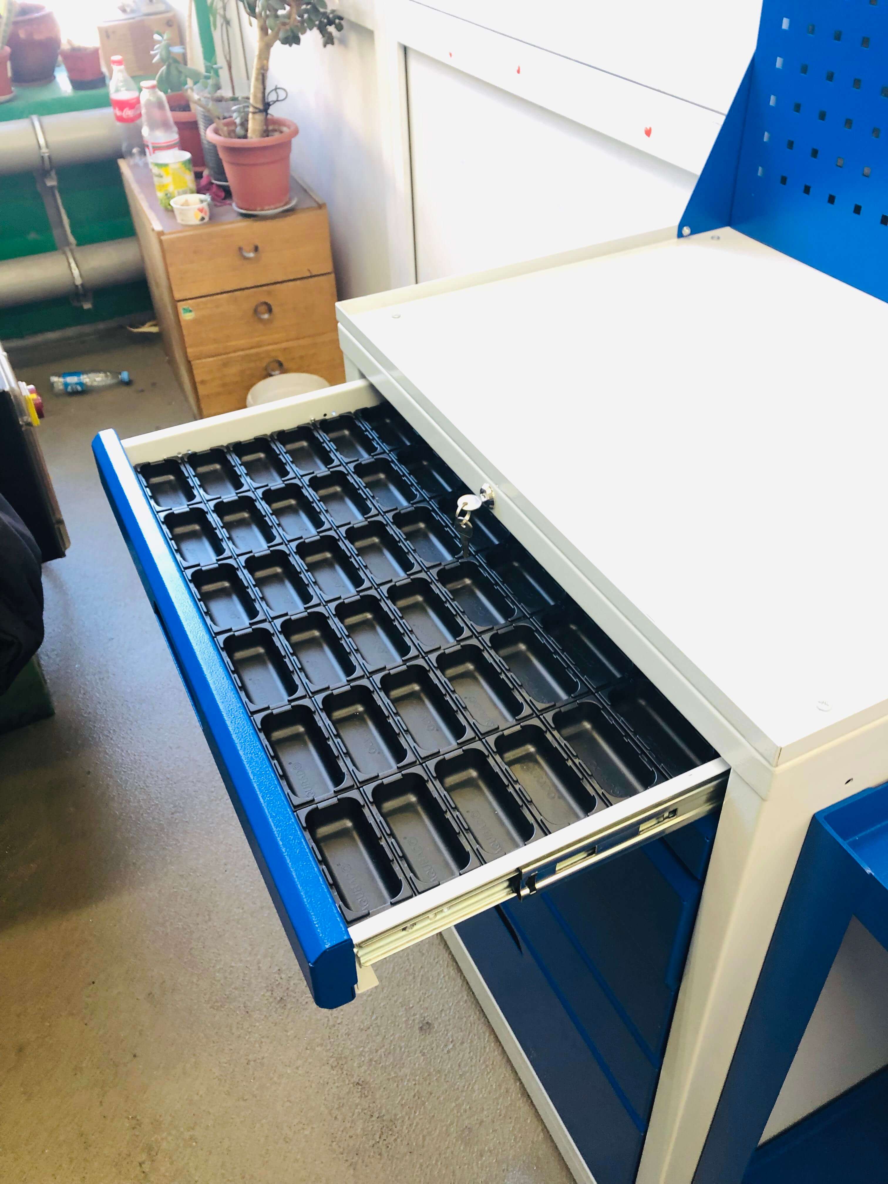 • Дополнительно на тумбы можно установить: столешницу из фанеры толщиной 30 мм, лоток с МБС резиной, экран перфорированный для наглядного размещения инструмента, а также два вида цоколей для транспортировки тумб и компенсации неровносттей пола