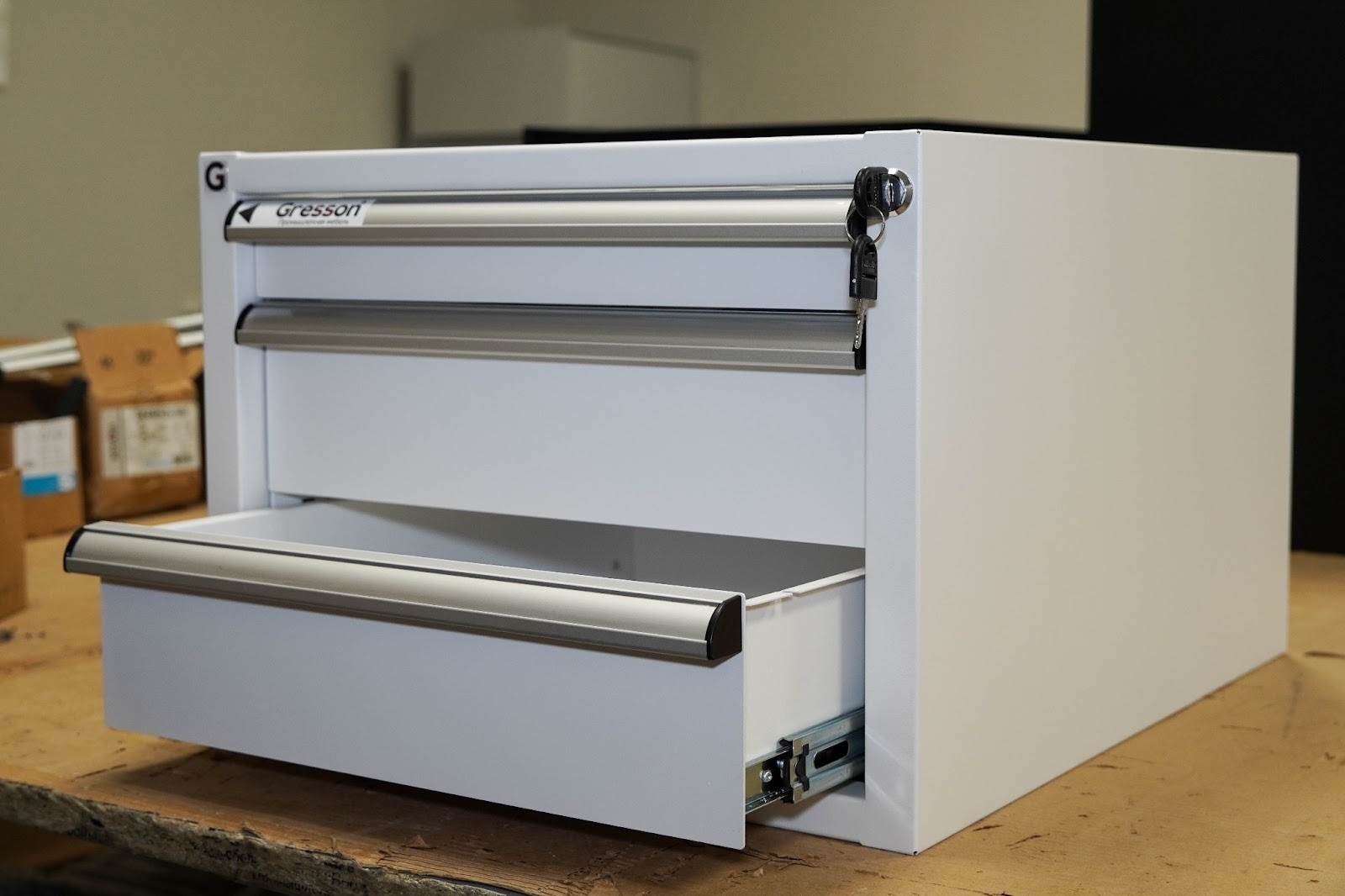 Все металлические тумбы Gresson оборудованы центральным замком для индивидуального доступа. Каркас и ящики тумб изготовлены из листового металла для увеличения эксплуатационного ресурса и повышения надежности. Ручки тумбы изготовлены из алюминиевого профиля с анодированным покрытием и боковыми пазами, для установки обозначения (маркировки) ящиков по их прямому назначению (подразделение организации, документация, инструменты, материалы и т.д.). Ящики тумбы выдвигаются во всю длину, облегчая доступ к материалам.
